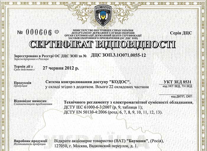 Получен сертификат соответствия, подтверждающий, что оборудование системы контроля доступа «Кодос» соответствует требованиям технического регламента по электромагнитной совместимости оборудования, согласно ГОСТу IEC 61000-6-3:2007, EN 50130-4:2006.